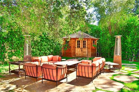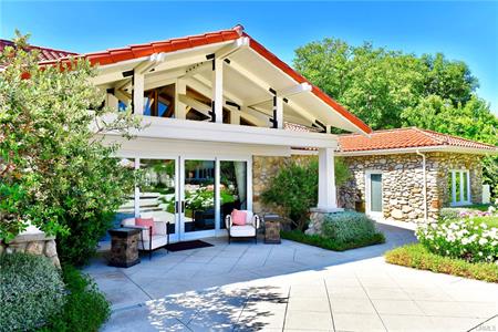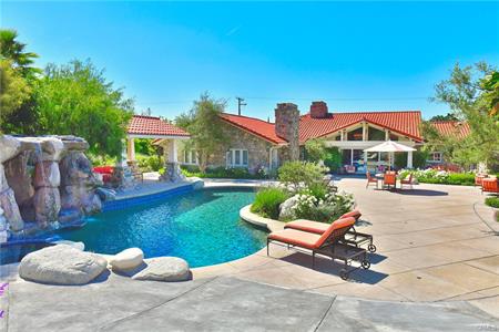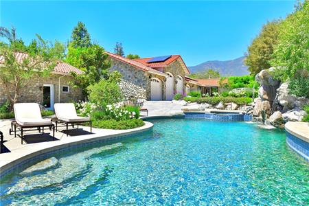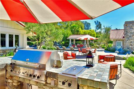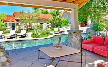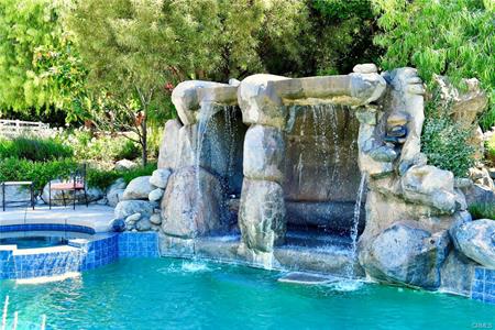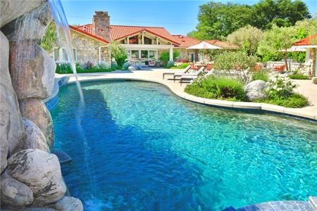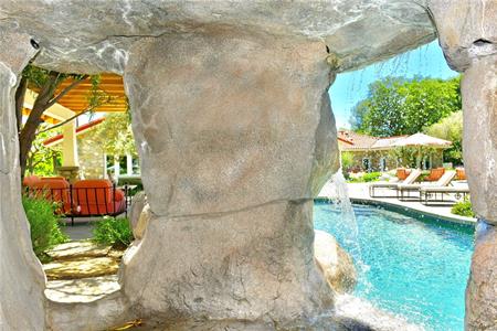sparkling pool & spa with rock grotto, and outdoor kitchen with
