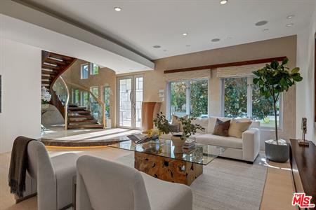 curved glass railings winds up to the second floor surrounded by