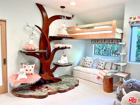 2. The basement features travertine flooring, large playroom