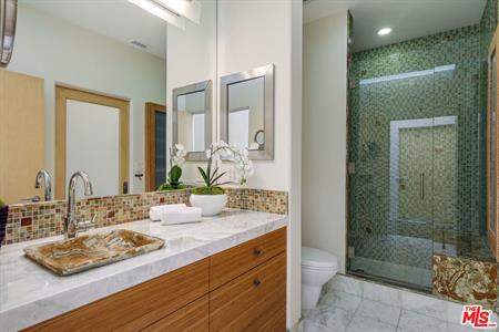 1. Vanity: Carrara marble countertops and floors, walnut