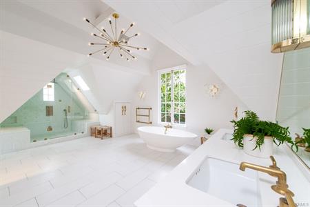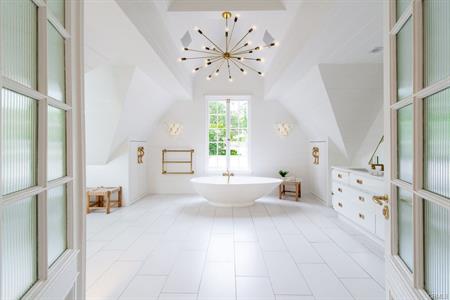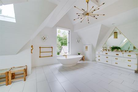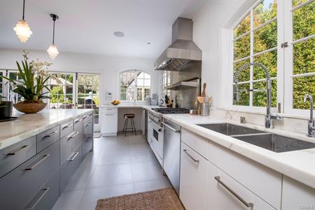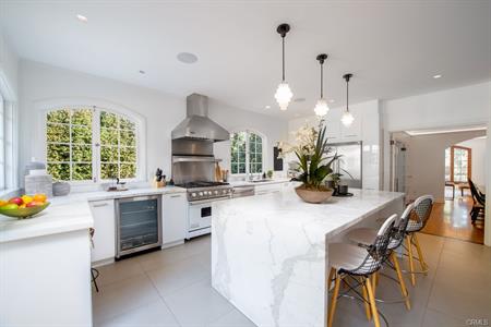 kitchen is highlighted by a Calacatta gold marble waterfall