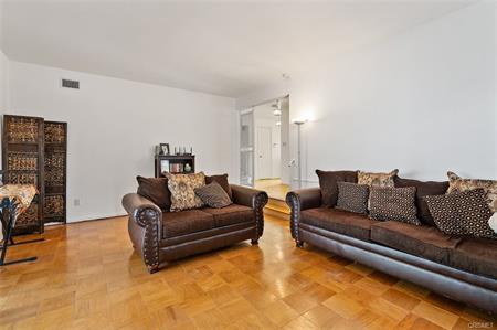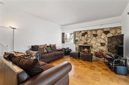 bath. Living room has a fireplace, parquet wood floors and a